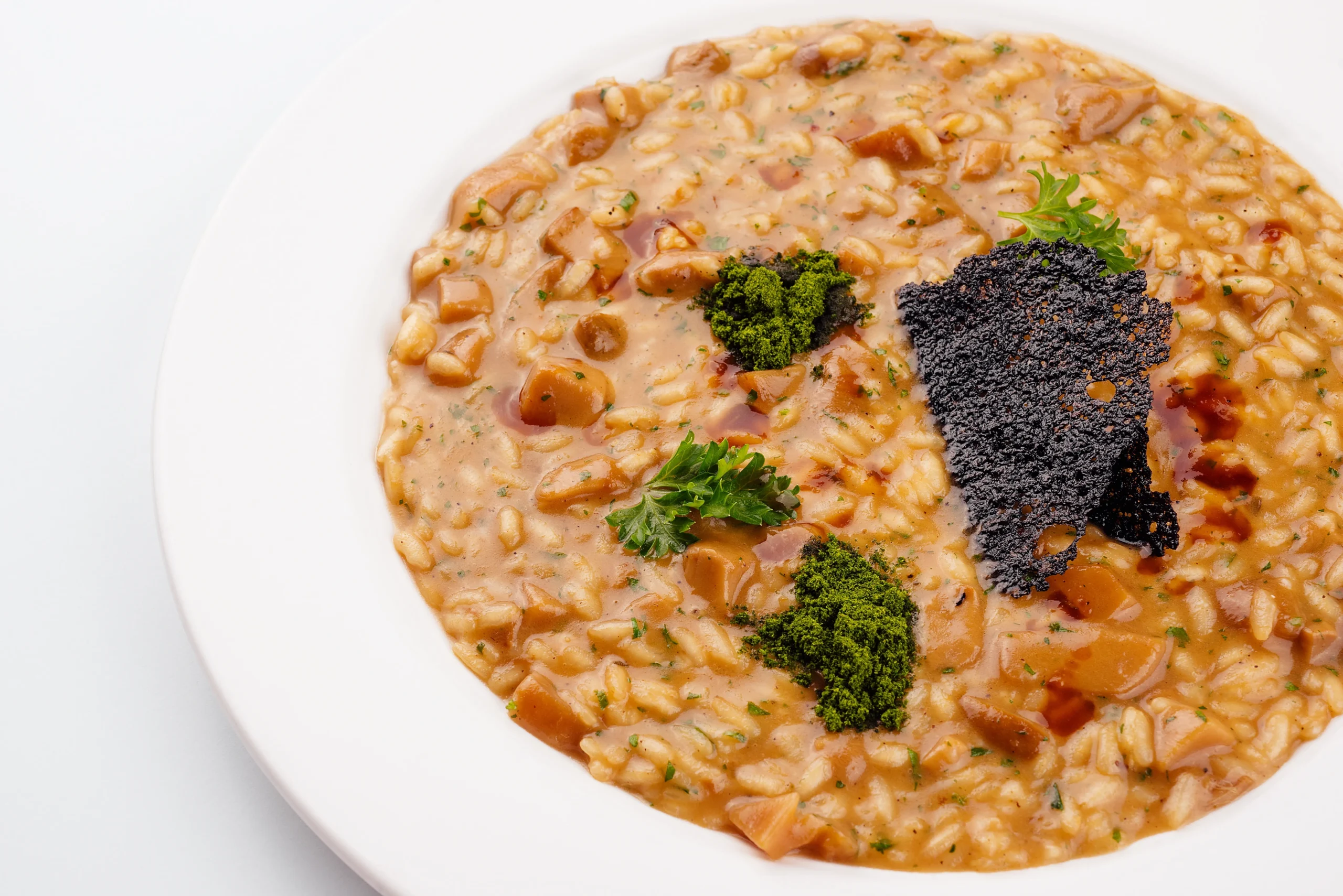 • Składniki: Vialone Nano, mieszanka grzybów (świeże lub suszone), cebula, czosnek, masło, oliwa, białe wino, bulion warzywny, natka, parmezan.